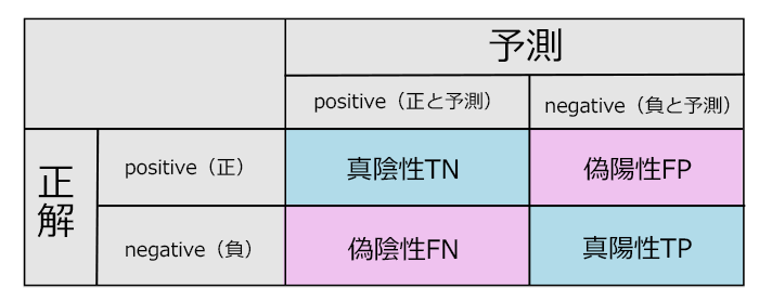2023年06月09日 混同行列(Confusion Matrix) 2 値分類問題で出力されたクラス分類の結果をまとめたマトリックスのこと。2 値分類機械学習モデルの性能を測る指標として使われる。 「G検定カンペ用語集」カテゴリの最新記事 タグ :#G検定#カンペ < 前の記事次の記事 >